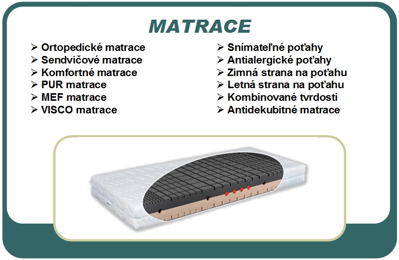 Kvalitné ortopedické matrace s výstuhou z RE peny, pre dlhšiu životnosť so snímateľným a antialergickým poťahom. Obojstranné duo matrace z komfortnej HR peny všetkých rozmerov a slovenskej výroby. Rozmery skladom: matrac MEDI - BASE 80x200x14cm / 90x200x15cm -67€ matrac MEDI DOU VISCO 80x200x16cm / 90x200x16cm -90€ matrac DUO-MEF pamäťová pena 80x200x16cm / 90x200x16cm -110€, a monoho ďalších. Možnosť objednania na 0908 302 222 alebo cez online obchod www.matrace-medipur.sk s dotáciou dopravy pre celú SR.