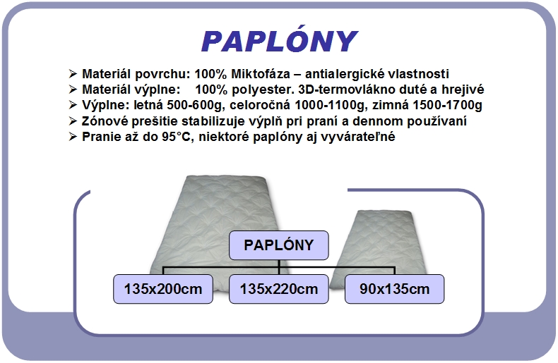 Paplóny z ľahkého 3D špirálového mikro-vlákna od 18€. Zimné paplóny s výplňou od 1400g z dutého 3D termovlákna od 20€. Doprava zdarma.