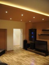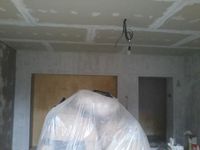 Montáž sadrokartónu - zníženie a zateplenie stropu, osadenie osvetlenia a farebného podsvietenia, vybudovanie priečky, podkrovia, osadenie schodov z podkrovia, vyrovnanie podkladu pre obklad (suchá omietka), konštrukciu skrinky pod umývadlá, vytvorenie policových zostáv, osadenie vstavaných WC (Geberit)