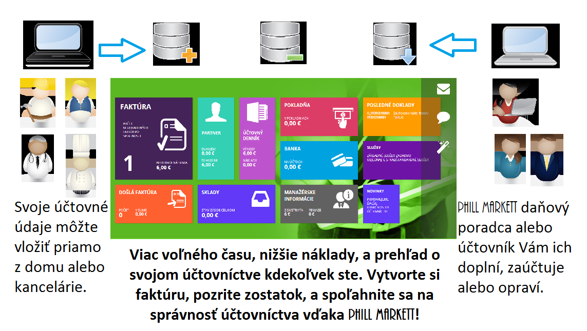 Nové technológie ako napríklad cloud, Vám môžu uľahčiť Vašu komunikáciu s účtovníkom, dávajú možnosť si jednoducho sami vytvoriť faktúry alebo zaevidovať nové skutočnosti, čím do istej miery odbremenia účtovníka o tie najjednoduchšie úkony a Vám dávajú možnosť byť flexibilnejším. Nižšie nároky na účtovníka samozrejme znamenajú nižšie náklady pre Vás. Viac o tejto technológií sa môžete dozvedieť na stránke Phill Markett. Cena za používanie tejto technológie Vás isto zaujme: takmer zadarmo. Optimalizácia procesov Lean Six Sigma je metóda stojaca na základoch snáh spoločností Toyota a Motorola o efektívne fungovanie. 80% firiem zo zoznamu Fortune 100 ju používa a ušetrili vďaka nej za 20 rokov vyše 420 biliónov dolárov, a teraz je dostupná aj pre menšie a stredné podniky prostredníctvom Phill Markett. Ponúkame Vám technológie pre efektívne procesy: automatizácia operácií na PC, robotizácia, meranie kvality a kvantity...Lean Six Sigma projekty sa prísne orientujú na splnenie merateľných cieľov, takže náklady budú vždy nižšie ako prínosy pre Vás, preto cena za implementáciu pre Vás je vždy...zadarmo. Kalkulácie Phill Markett Vám ponúka uplatnenie technológií pre zjednodušenie, sprehľadnenie a zefektívnenie kalkulácií, analýzy ziskovosti a controlling. Náš softvér Vám umožní spárovať záznamy z účtovníctva s Vašimi procesmi: dozviete sa náklady na každú aktivitu ktorú vykonávate a výnosy z každej Vašej aktivity- to Vám bežne účtovníctvo neumožňuje. Phill Markett Vám ponúka licenciu a zaškolenie na špecializovanom softvéry, alebo len jednorázovú analýzu a poskytnutie metodiky. Optimalizácia marketingu a obchodnej politiky Phill Markett Vám ponúka analýzu Vašej súčasnej marketingovej a obchodnej politiky a následnú ponuku lacnejších a efektívnejších nástrojov: od billboardov, letákov, audio/video reklamy, eventov, merchandisingu až po web marketing, zvlášť v dnešnej dobe veľmi nutný a pritom nákladovo nenáročný nástroj. Využitím služieb Phill Markett sa Vám dostane profesionálneho prístupu, optimalizácie nákladov a zvýšenie účinnosti marketingovej a obchodnej politiky. Vždy je čo zlepšiť alebo na čom ušetriť. Pre viac informácií nás kontaktujte na info@phill-markett.sk alebo na www.phill-markett.sk . Ďakujeme a tešíme sa na spoluprácu.