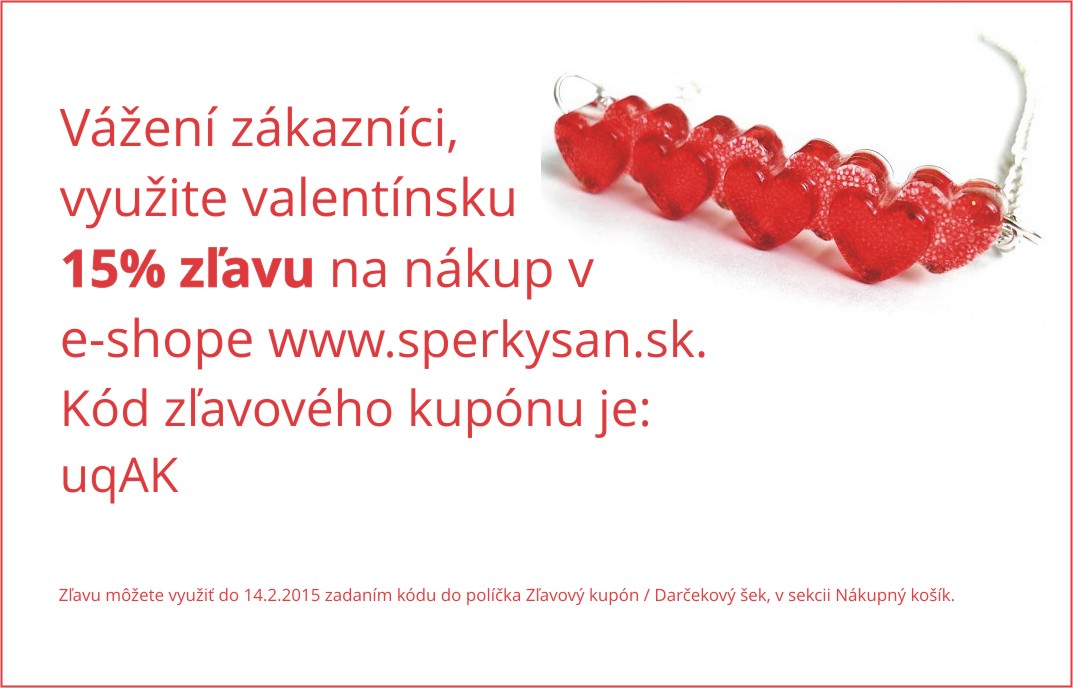 Rozhodli sme sa potešiť vás zľavou na nákup vo výške 15% v e-shope www.sperkysan.sk, aby ste mohli obdarovať seba alebo svojich blízkych pekným a výnimočným šperkom. Stačí ak pri objednávke zadáte do políčka zľavový kupón, kód: uqAK a po dokončení objednávky vám bude odpočítaná suma vo výške 15% z nákupu. Kupón je využiteľný viac krát, preto budeme rady, ak ho budete zdieľať ďalej.